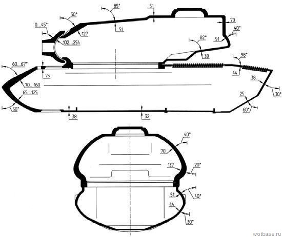 Бронирование танка M103 (Историческое): -------------------------------------------------------------- Лоб корпуса (верх), мм/град. — 127/60° Лоб корпуса (низ), мм/град. — 114/50° Борт корпуса (верх), мм/град. — 51/40° Борт корпуса (низ), мм/град. — 44/30° Корма корпуса (верх), мм/град. — 38/30° Корма корпуса (низ), мм/град. — 25/60° Крыша корпуса, мм — 25 Лоб башни, мм/град. — 127/50° Маска орудия, мм/град. — 102…254/0…45° Борт башни, мм/град. — 70…137/20…40° Корма башни, мм/град. — 51/40°