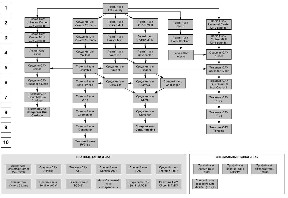 | До анонса британской ветки еще далеко. Но можно сказать точно, что английское дерево будет в основном состоять из английских танков. А техника других стран объединенного королевства будет представлена премиумными танками.