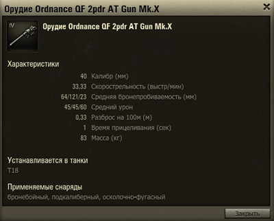 | Орудие: Ordnance QF 2-pounder (40-мм) (ТТХ взяты с аналогичной пушки с ПТ Т18) -------------------------------------------------------------------------------------------------------