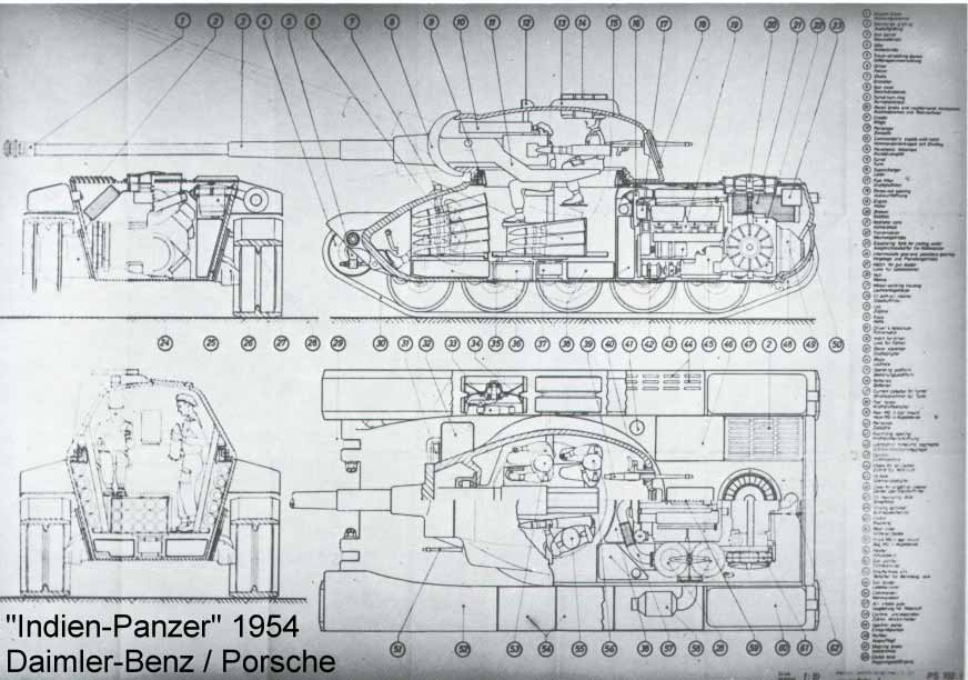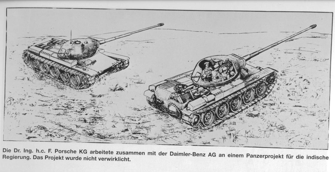 Годы разработки: 1954-1955. Индийские требования предполагали вес порядка 36-39 тонн, немецкий проект около 40 тонн.8-ми цилиндровый дизель Daimler-Benz MB-837A мощностью 670 л.с. Соотношение мощности к весу: 16,7 л.с./т Максимальная скорость: 50 км/ч Калибр пушки - 90 мм Броня: корпус до 90мм, лоб башни до 130 мм, корпус и башня литые. Porsche отвечал за общую разработку Zahnradfabrik AG of Friedrichshafen- ходовая часть. Ruhrstahl - башня и орудие. Производство предполагалось в Индии, концерном TATA.Также в Индии предполагалось производить оптику и приборы.Но индусы на тот момент были не в состоянии производить необходимые литые бронедетали. В результате победителем стала фирма Виккерс, со своим Vickers Mk1, который мы знаем как Vijayanta.Однако опыт работ не пропал даром, данная конструкция была положена в основу KW30, являющимся предком целой линейки швейцарских Pz.