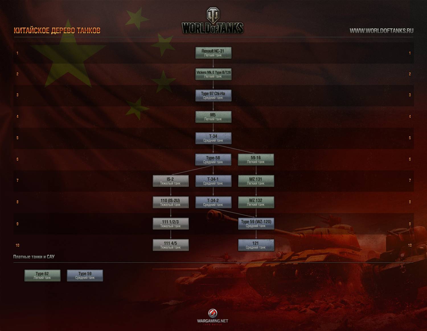 Лёгкие — Renault NC-31, Vickers Mk.E Type B/T26, M5, 59-16, WZ131, WZ132. Средние — Type 97 Chi-Ha, T-34, Type58, T-34-1, T-34-2, Type 59 (WZ-120), 121. Тяжёлые — IS-2, 110 (IS-2U), 111 1/2/3, 111 4/5.